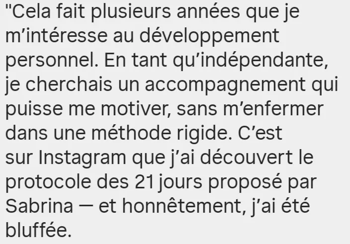 Oui, tu as accès aux contenus pendant à vie ( sauf cas de force majeur) ! Même si le programme est pensé pour être suivi sur 21 jours pour maintenir une dynamique, tu es totalement libre d’adapter le rythme selon ton agenda. L’essentiel est de rester engagé dans ton processus. Même si tu mets un peu plus de temps, les transformations seront toujours au rendez-vous !